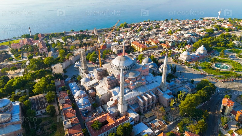 Святая София и площадь Султанахмета в районе Фатих под чистым небом, освещенным утренним солнцем