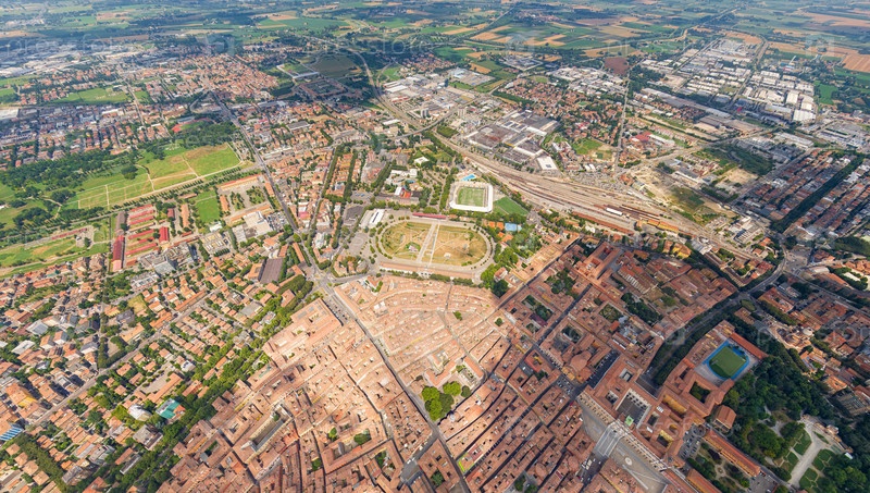 Модена, Италия. Исторический центр. Панорама города в летний день. Солнечная погода с облаками. Вид с воздуха