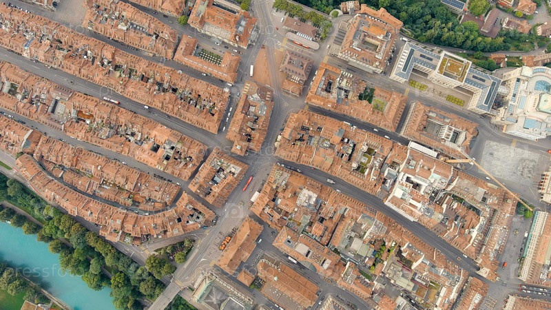 Берн, Швейцария. Историческая улица Крамгассе. Панорама города с видом на исторический центр. Летнее утро, Aerial View