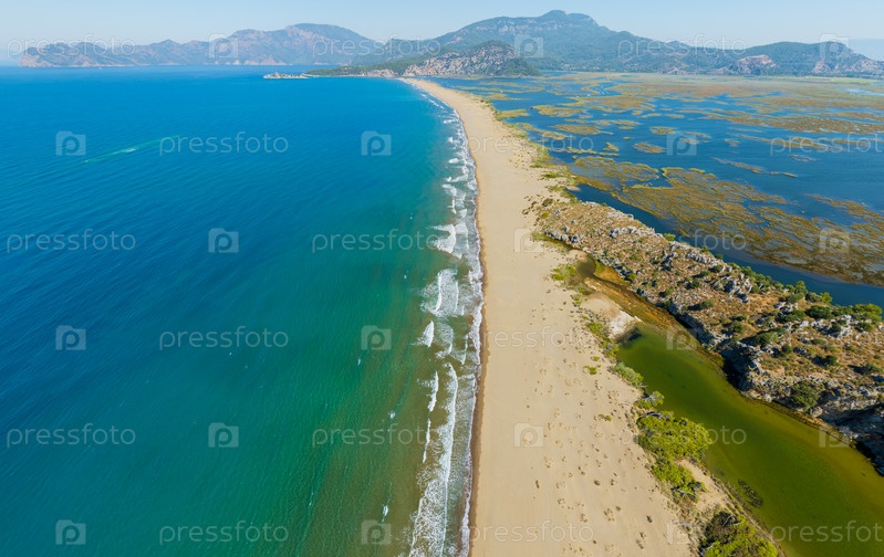 Перспектива из воздуха береговой линии пляжа черепах Изтузу, где море и пролив создают уникальную среду обитания для морской жизни