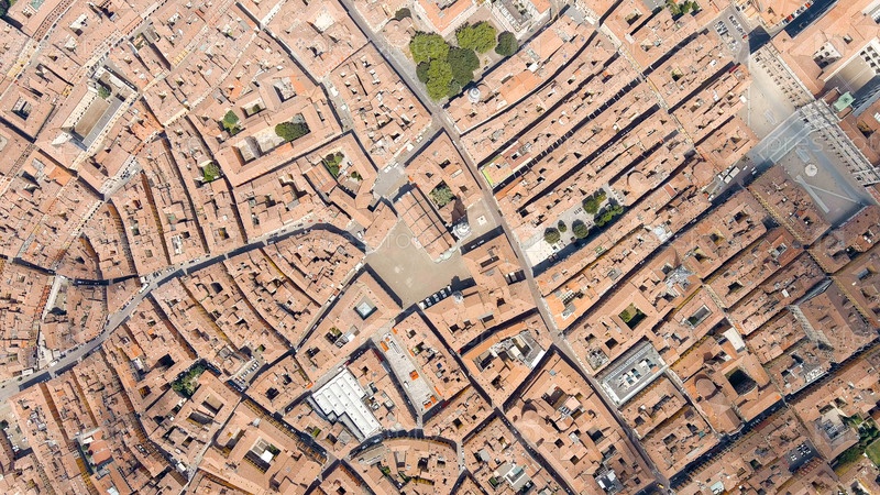 Модена, Италия. Собор Модены. Знаменитый романский собор с колокольницей. Исторический центр. Летом, взгляд из воздуха