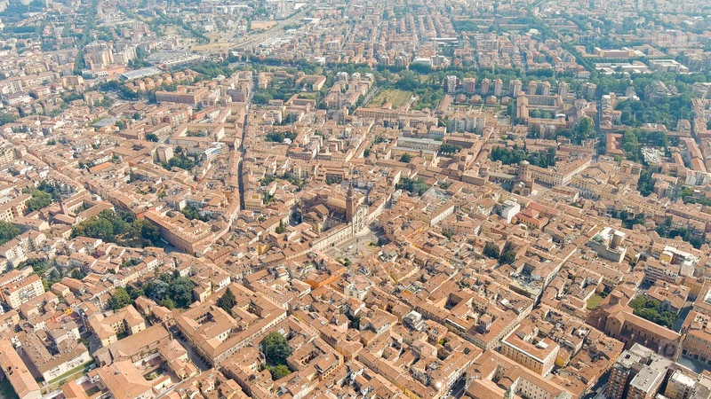 Пиаценца, Италия. собор Пьяченцы. епископский дворец. исторический центр города. летний день, взгляд с воздуха