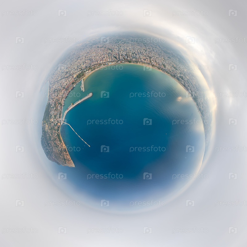 Маленькая планета стереографическая проекция из моря за маяком, показывающая полуостров, круизный порт, пляжи и горы Телец