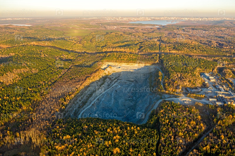 Каменный карьер среди леса. Летающий над осенним смешанным лесом во время захода солнца. Урал, Россия. На расстоянии виден город Екатеринбург