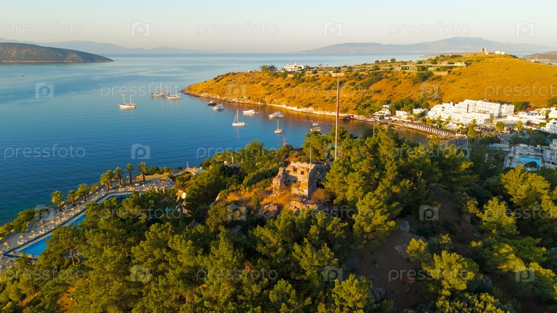 Бодрум, Турция.Утренний вид древней башни Тигра на лесистом холме с использованием беспилотного летательного аппарата.Эта сторожевая башня IV века до нашей эры была построена при короле Маузолосе в рамках системы обороны Галикарнасса