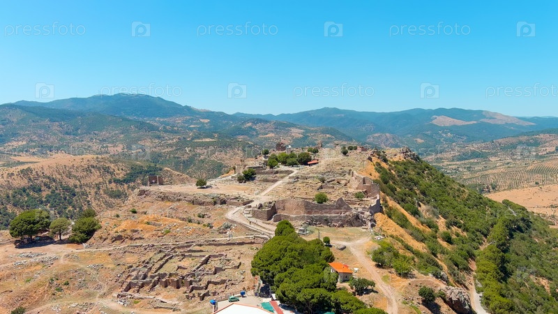 Вершина горы с руинами дворца Эумена и окружающими горами в ветреный жаркий полдень