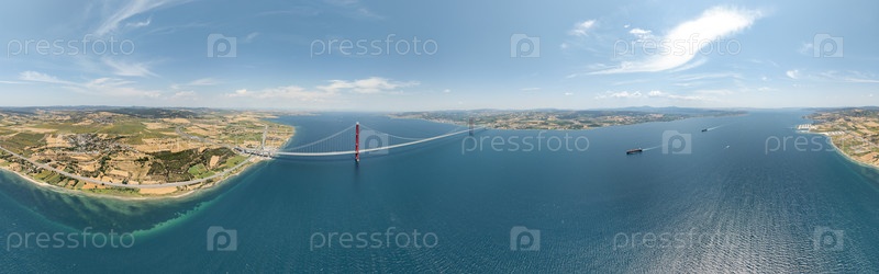 Лапсеки, Турция. цилиндрическая панорама 360 градусов Дарданелльского пролива с мостом Чанаккале 1915 года и двумя грузовыми кораблями на воде. вид из воздуха