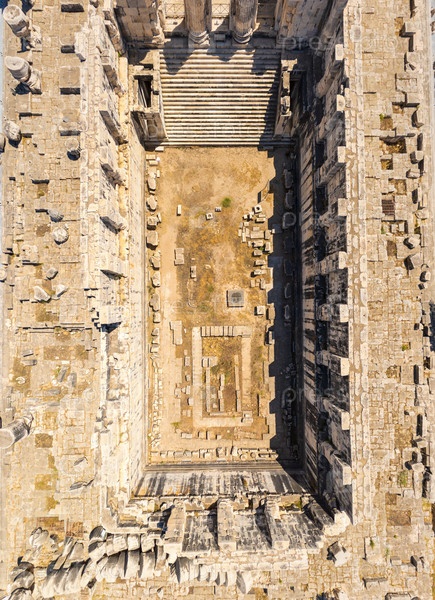 Дидим, Турция.Взгляд сверху вниз на руины древнего храма Аполлона, показывающие каменные узоры и сломанные колонны непосредственно сверху.Вид с воздуха