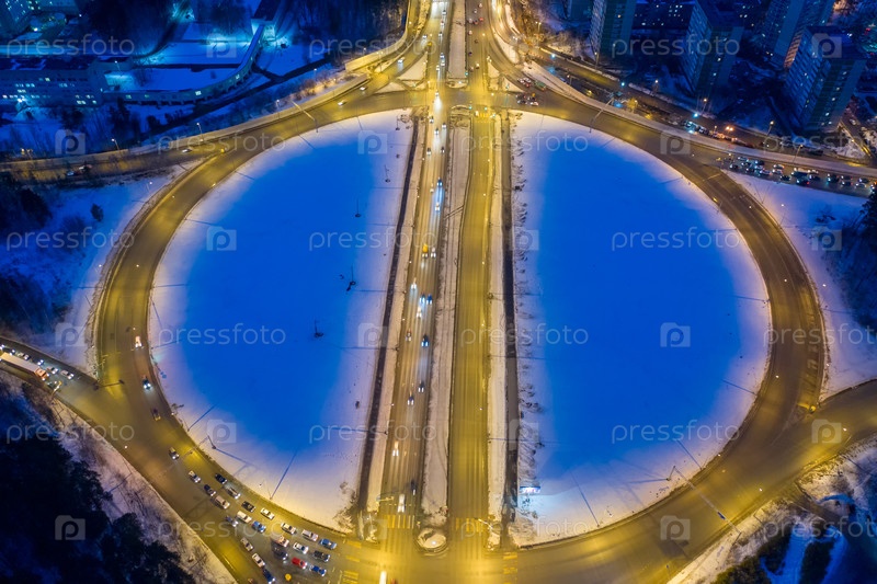 Екатеринбург, Россия Круговорот с перекрестками, освещенными фонарями.Ночной вид на город