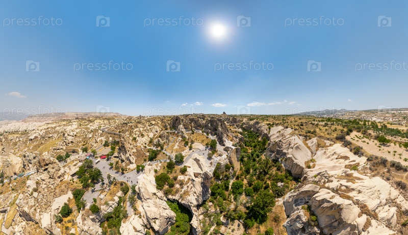 Широкая воздушная панорама музея под открытым небом Goreme, расположенного среди вулканических скальных образований Каппадокии и эродированных фейерских дымоходов