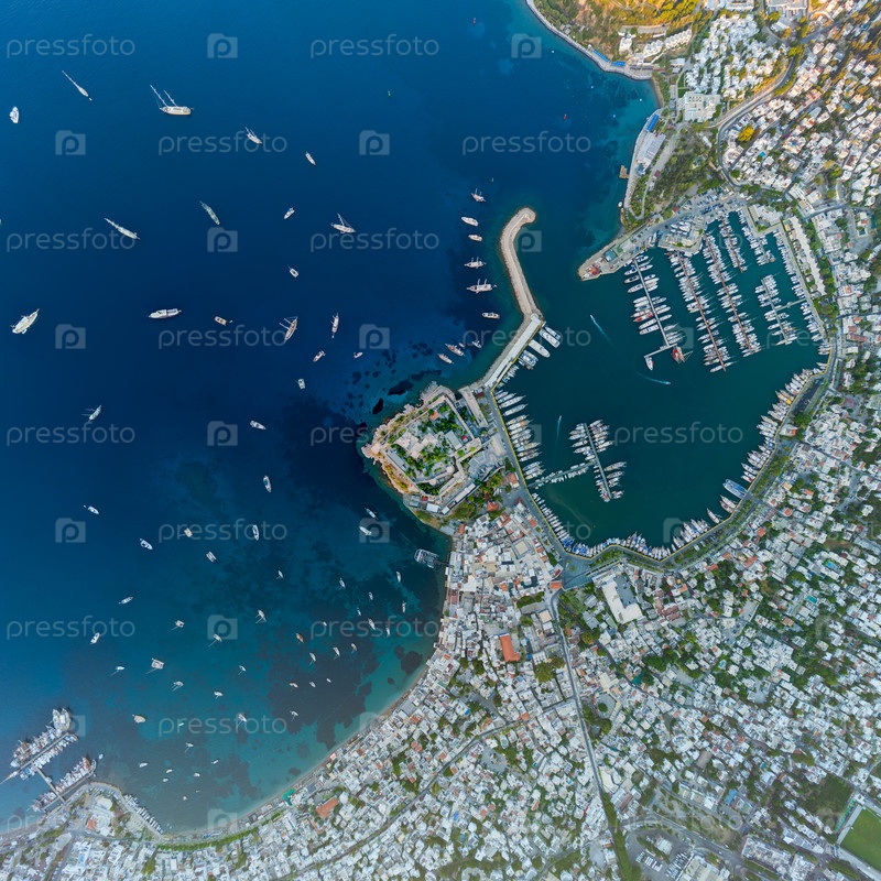 Прямой надводный утренний вид на Бодрумский замок, окруженный марина-комплексом, множеством бухт, многочисленными яхтами и песчаными пляжами сверху