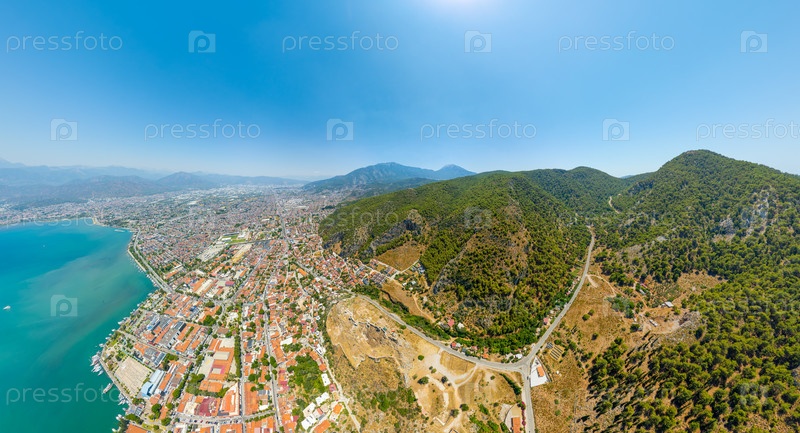 Панорамный вид из воздуха на замок Фетхие над голубой бухтой, горами, скалами с ликийскими гробницами и современным городским пейзажем