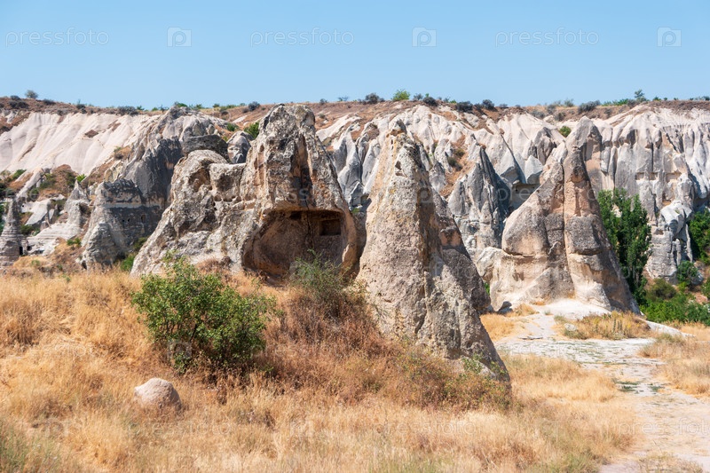 Ландшафт с разрушенными скальными образованиями, естественными арками и пещерами, сухой травой и кустарниками на переднем плане, ясное голубое небо