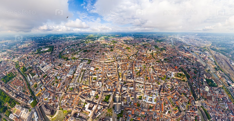 Гент, Бельгия. Центр города и его окрестности. Жилые и промышленные районы. Панорама на город. Летний день, облачная погода. Вид с воздуха