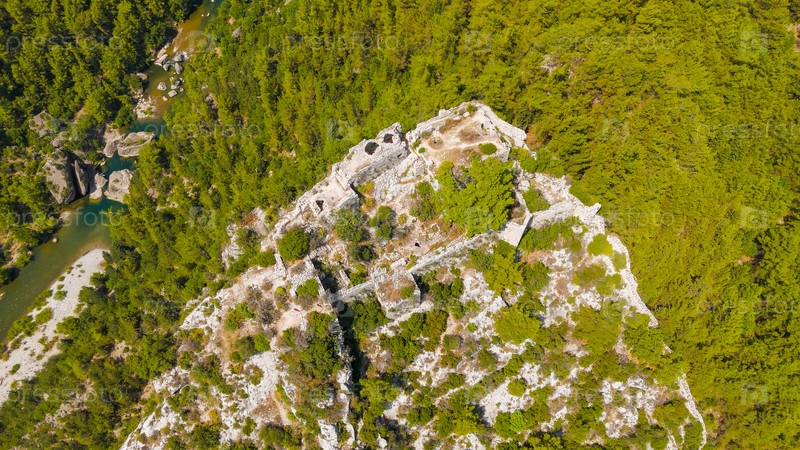 Снимок с беспилотника средневековых оборонительных стен и башен замка Алара на вершине холма