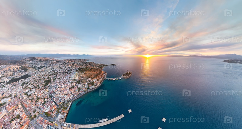 Кусадаси, Турция.Панорама с воздуха на горы, остров Голубей, залив и солнце.Природные прибрежные пейзажи с культовыми достопримечательностями.Вид с воздуха
