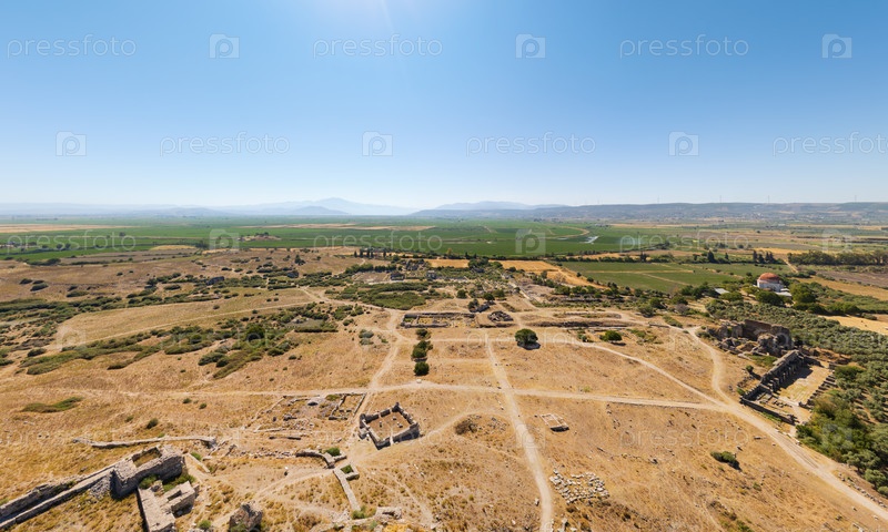 Панорама из воздуха древнего городского планирования Милета, демонстрирующая градостроительство и архитектурные остатки за исключением театральной структуры