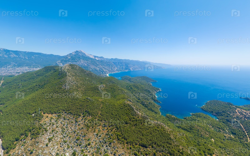 Панорама из воздуха лесистых горных склонов с древними руинами города-призрака и видом на Средиземное море под ясным летним небом, исторический прибрежный ландшафт