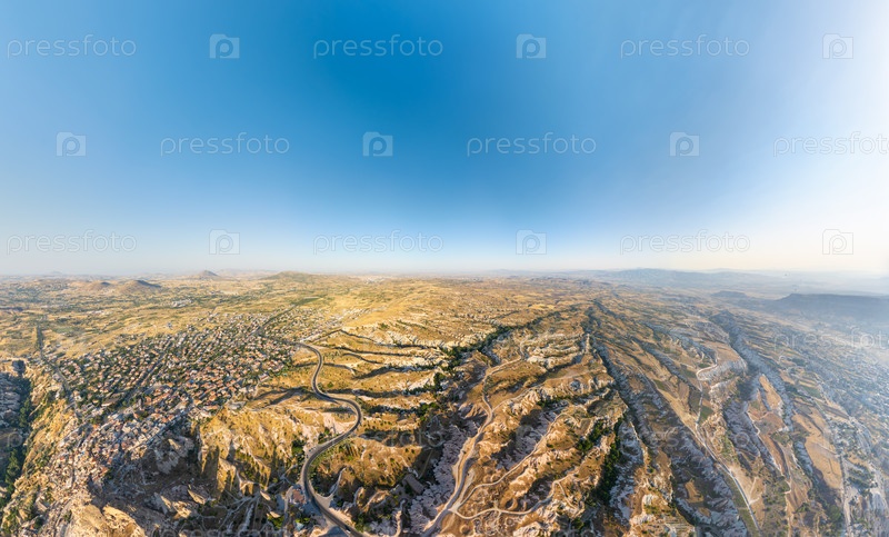 Вид с воздуха на плато Каппадокии, расчлененное глубокими долинами с скальными образованиями и эрозированной вулканической местностью под ярким утренним солнцем