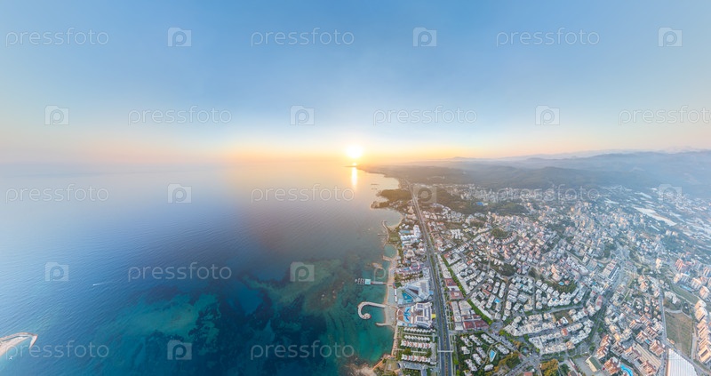 Виды на средиземноморское побережье при закате солнца, лесистые холмы, встречающие золотые пляжи и спокойные бухты