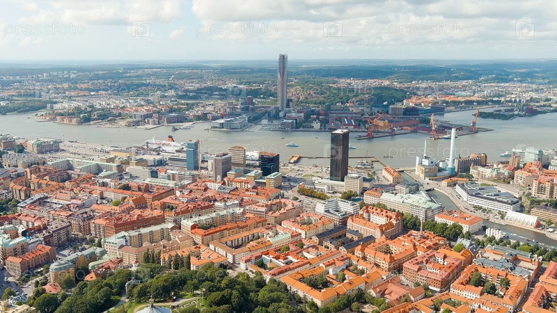 Гетеборг, Швеция. Река Гота-Альв. Панорамный вид на центральную часть города. Летний день. Облачная погода, Aerial View