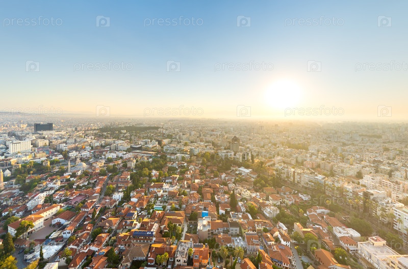 Анталия, Турция.Аэрофотосъемка исторического района Калейчи с красными крышами перед расширяющейся современной жилой застройкой, захваченная в ясный утренний свет