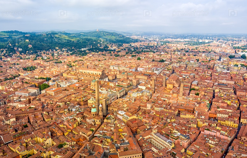 Болонья, Италия. башни 12-го века с видом на город, построенные итальянскими дворянскими семьями. символ Болоньи. панорама города в летний день. солнечная погода. вид из воздуха