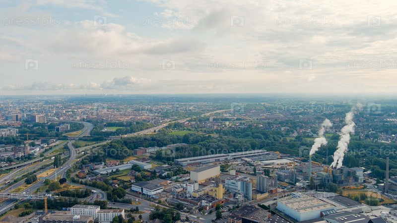 Гент, Бельгия. Солнечные лучи и красивые облака. На земле - пригород города Гента с промышленным районом и железной дорогой, небольшими домами. Ringvaart in Ghent - водный канал, Aerial View
