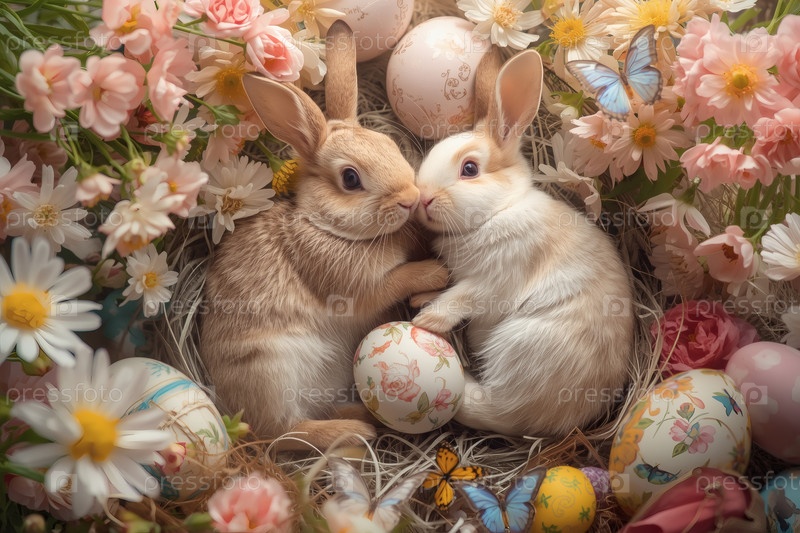 Праздничная открытка или баннер. пасхальные кролики, сидящие на траве с весенними цветами, пасхальными яйцами и бабочками. концепция счастливой Пасхи в 2026 году