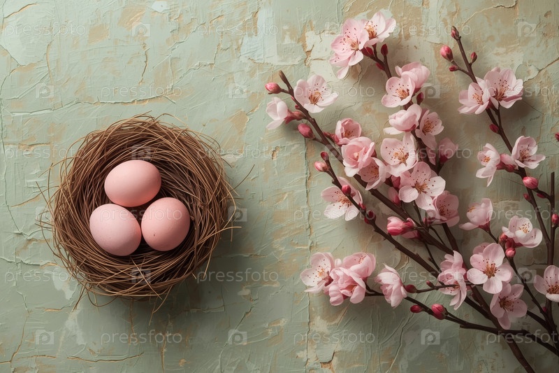 Пасхальные яйца в гнезде ветвей и сакуры на зеленом фоне с грубыми штрихами.Концепция счастливой Пасхи 2026