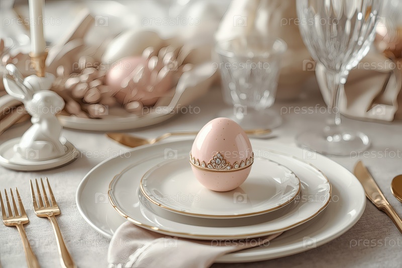 Пасхальный баннер 2026. настройка стола. декоративная тарелка, посуда, стаканы, пасхальные яйца и кролики. концепция празднования Пасхи для кафе и ресторанов
