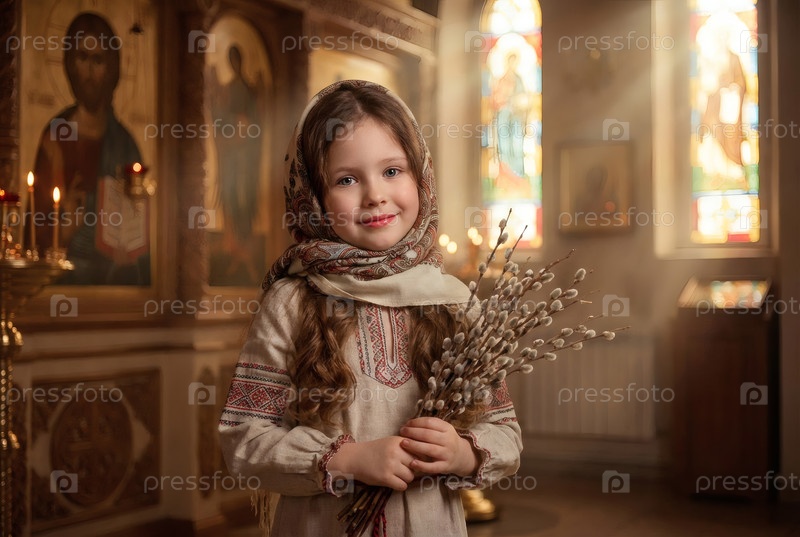 Религия и вера. Пальмовое воскресенье. Портрет маленькой девочки в русском народном плато с букетом верби внутри церкви
