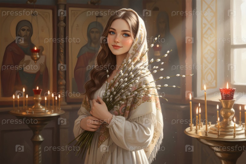 Религия и вера. Пальмовое воскресенье. Портрет маленькой девочки в русском народном плато с букетом верби внутри церкви