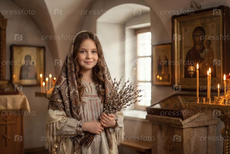 Религия и вера. Пальмовое воскресенье. Портрет маленькой девочки в русском народном плато с букетом верби внутри церкви
