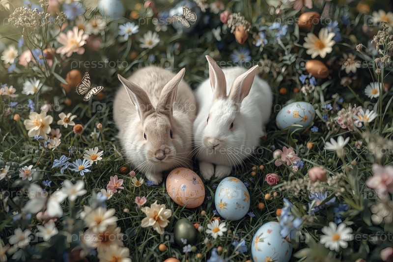 Праздничная открытка или баннер. пасхальные кролики, сидящие на траве с весенними цветами, пасхальными яйцами и бабочками. концепция счастливой Пасхи в 2026 году