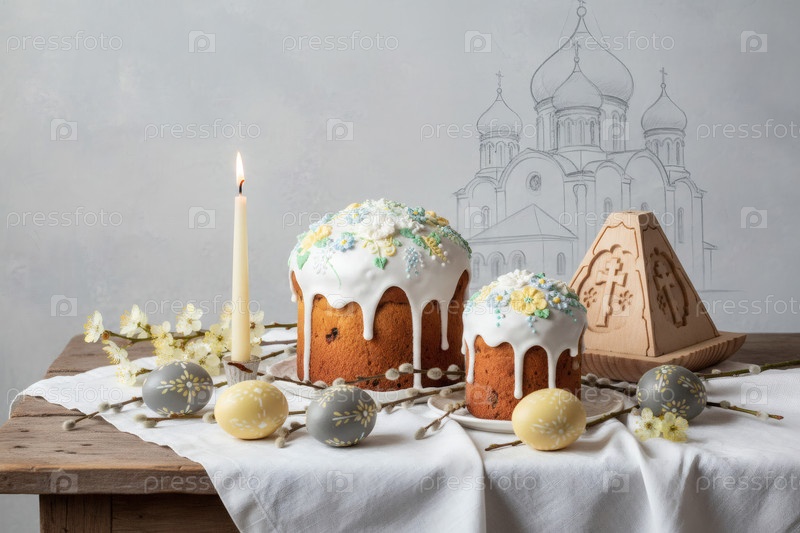 Пасхальные яйца, пасхальный торт, ива, цветы вишни и творог на серой стене с шаблоном храма.Концепция счастливой Пасхи 2026