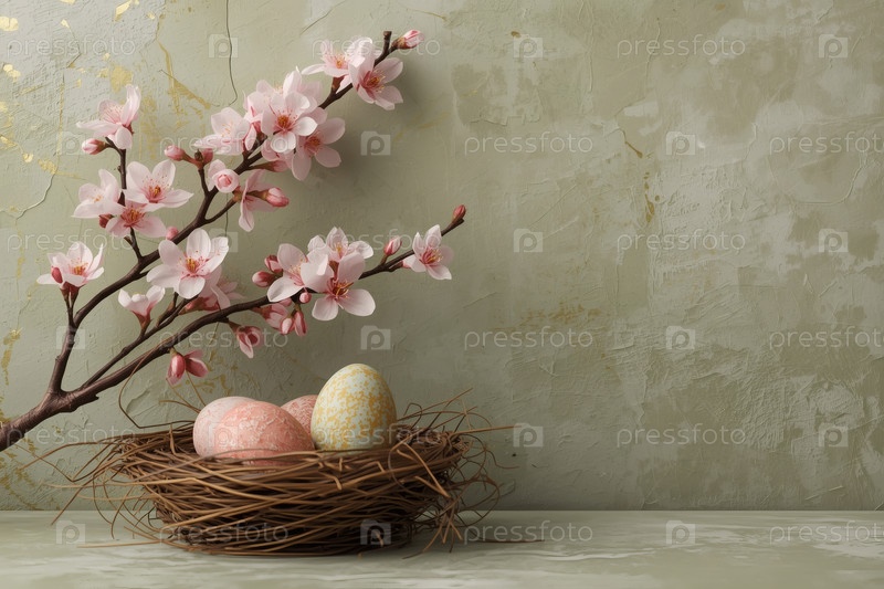 Пасхальные яйца в гнезде ветвей и сакуры на зеленом фоне с грубыми штрихами.Концепция счастливой Пасхи 2026