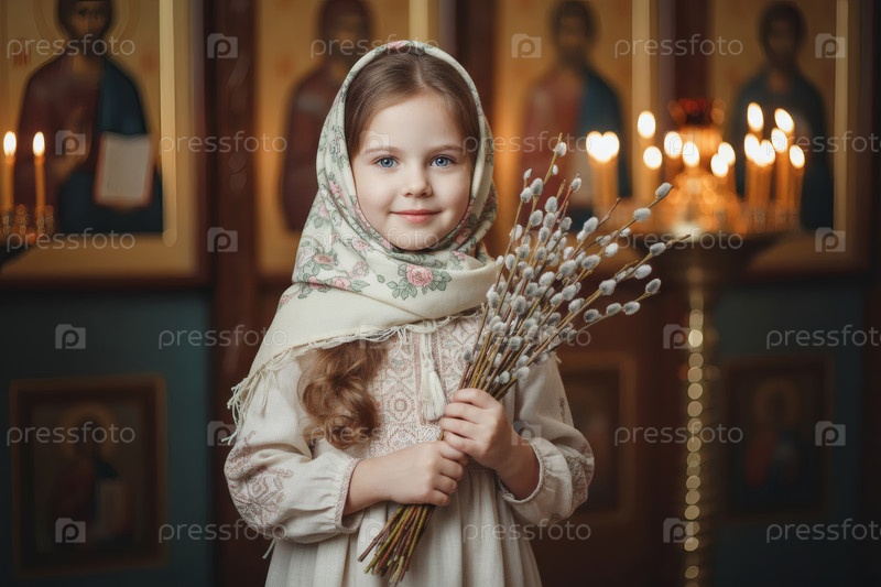 Религия и вера. Пальмовое воскресенье. Портрет маленькой девочки в русском народном плато с букетом верби внутри церкви