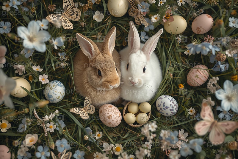 Праздничная открытка или баннер. пасхальные кролики, сидящие на траве с весенними цветами, пасхальными яйцами и бабочками. концепция счастливой Пасхи в 2026 году