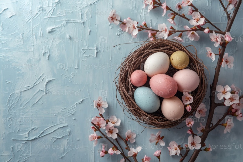 Пасхальные яйца в гнезде ветвей и нежная сакура на синем фоне с грубыми текстурированными штрихами