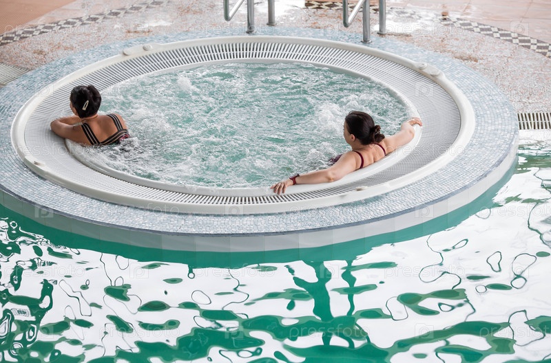 Две женщины отдыхают в круглом джакузи у бассейна Концепция релаксации, спа-процедур и омоложения в отеле