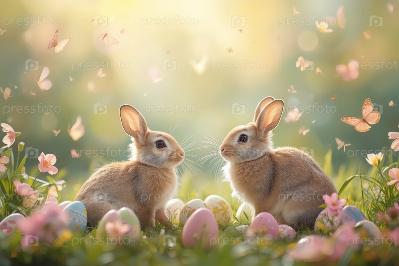 Праздничная открытка или баннер. пасхальные кролики, сидящие на траве с весенними цветами, пасхальными яйцами и бабочками. концепция счастливой Пасхи в 2026 году