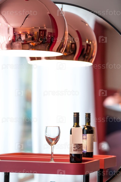 Роскошный, стильный натюрморт.Стеклянные бокалы и бутылка красного вина на бургундском столе.Концепция романтического ужина или вечеринки