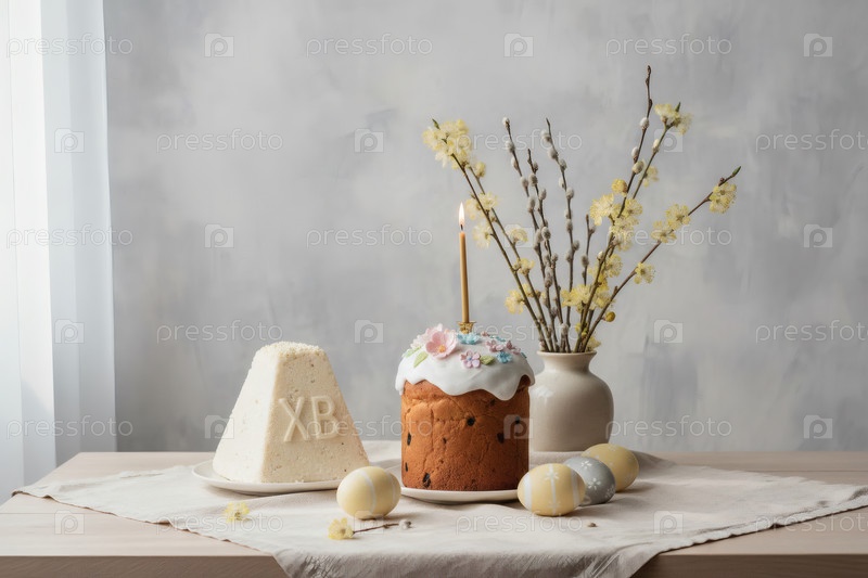 Пасхальные яйца, пасхальный торт, верба, кофейный сыр Пасха и фон сакуры с грубыми штрихами.Концепция счастливой Пасхи 2026