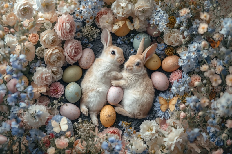 Праздничная открытка или баннер. пасхальные кролики, сидящие на траве с весенними цветами, пасхальными яйцами и бабочками. концепция счастливой Пасхи в 2026 году