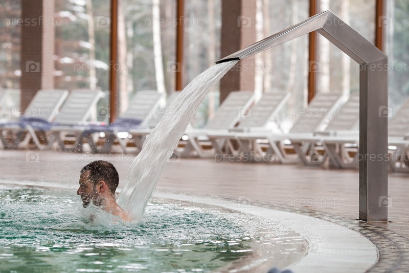 Мужчина в бассейне под водопадом для массажа спины и шеи, с шезлонгами на заднем плане. Водоснабжение высокого давления. Концепция релаксации, спа-процедур и омоложения в отеле. Туризм