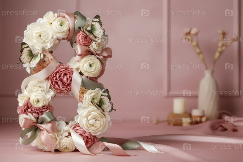 Международный женский день. баннер, флаер, красивая открытка на 8 марта. цветы в форме цифры восемь и бабочки на простом фоне