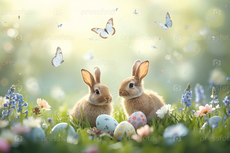 Праздничная открытка или баннер. пасхальные кролики, сидящие на траве с весенними цветами, пасхальными яйцами и бабочками. концепция счастливой Пасхи в 2026 году