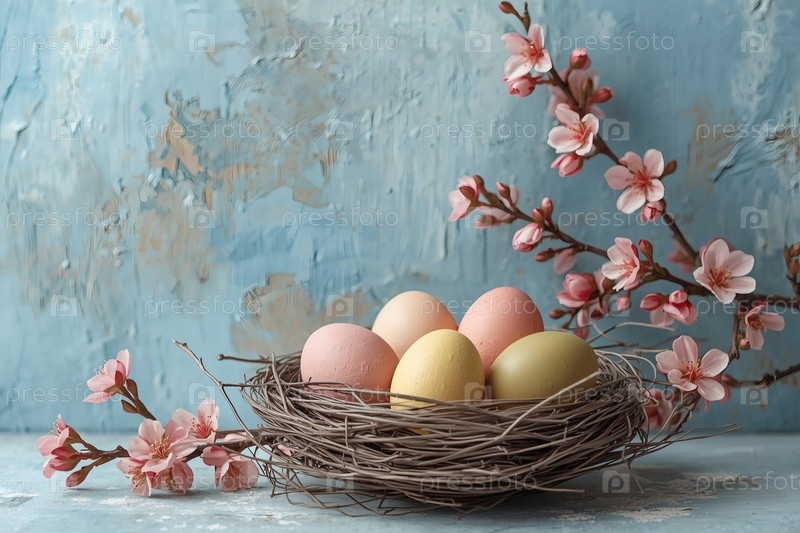 Пасхальные яйца в гнезде ветвей и нежная сакура на синем фоне с грубыми текстурированными штрихами