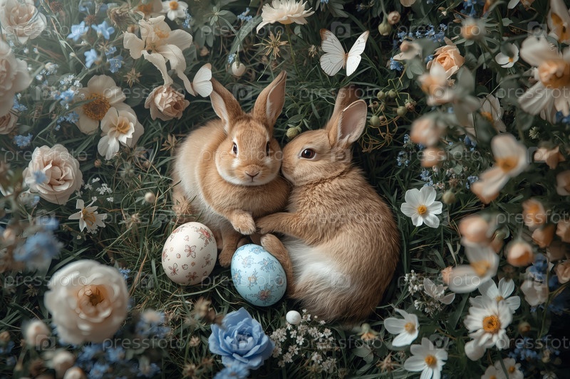 Праздничная открытка или баннер. пасхальные кролики, сидящие на траве с весенними цветами, пасхальными яйцами и бабочками. концепция счастливой Пасхи в 2026 году
